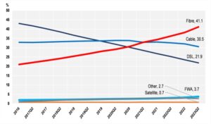 In tre anni cambiato radicalmente lo scenario. Nonostante le forti attivazioni in Fwa, +64%, il fixed wireless access ha una marketshare di appena il 3,7% contro il 41% della fibra. Le tecnologie Dsl in calo del 24%, la quota scende al 22%. In aumento il satellite: +11% ma vale appena lo 0,7% della torta